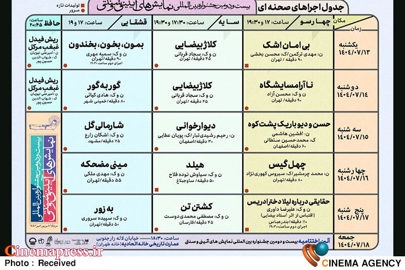 جدول اجراهای «بیست‌ودومین جشنواره بین‌المللی نمایش‌های آیینی و سنتی» منتشر شد