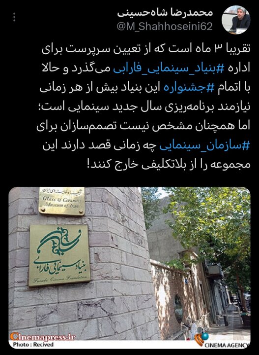 سینماپرس: «محمدرضا شاه‌حسینی» سردبیر سینماپرس با انتقاد از عدم تعیین تکلیف مدیریت «بنیاد سینمایی فارابی» نوشت: تقریبا ۳ ماه است که از تعیین سرپرست برای اداره مهمترین رکن حمایت از فیلمسازی در کشور یعنی «بنیاد سینمایی فارابی» می‌گذرد و حالا پس از اتمام «جشنواره فیلم فجر» این بنیاد بیش از هر زمانی نیازمند برنامه‌ریزی برای «سال جدید سینمایی» است.
