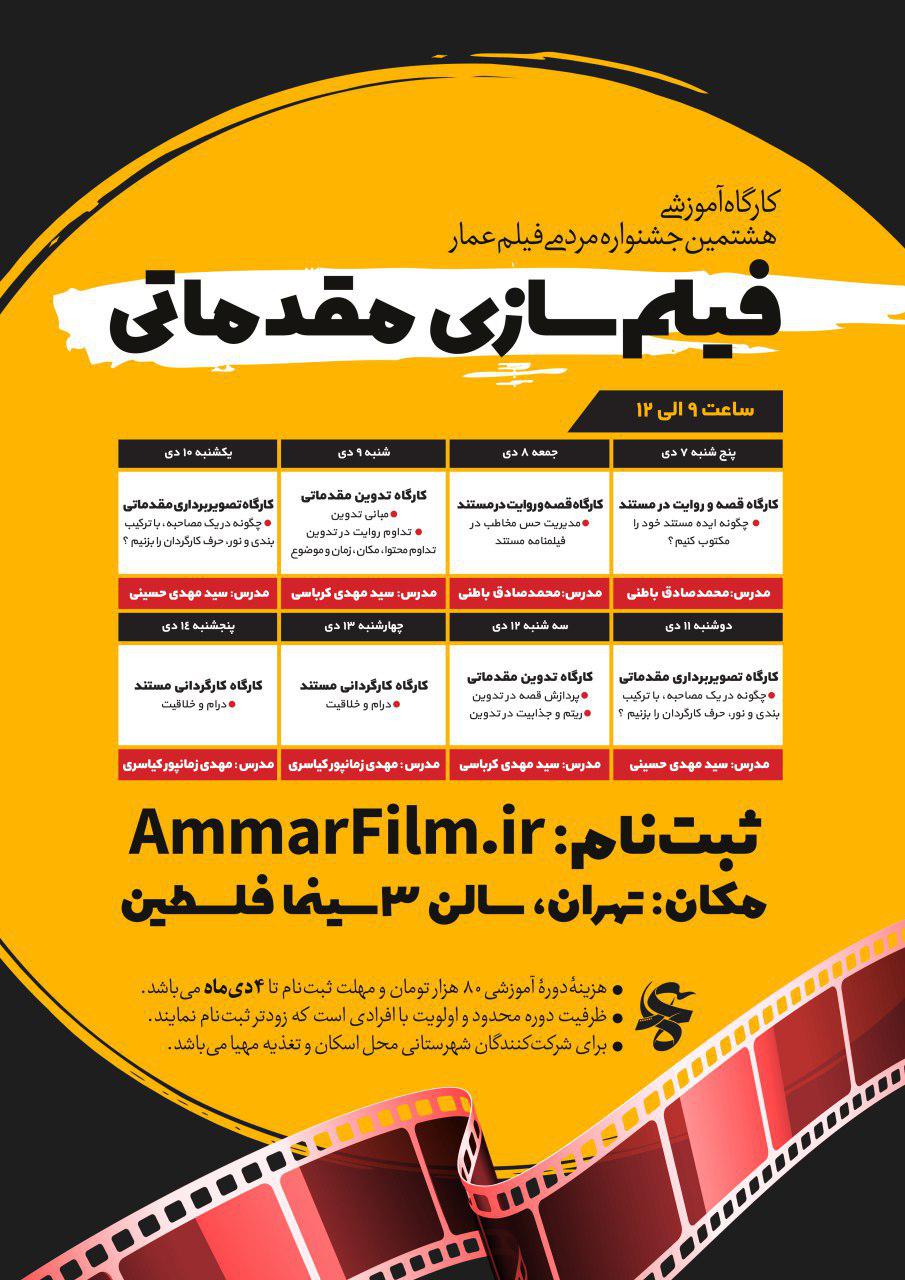 به گزارش سینماپرس، در آستانه برگزاری هشتمین دوره جشنواره مردمی فیلم عمار، ثبتنام کارگاههای آموزشی فیلمسازی مقدماتی این جشنواره آغاز شد.